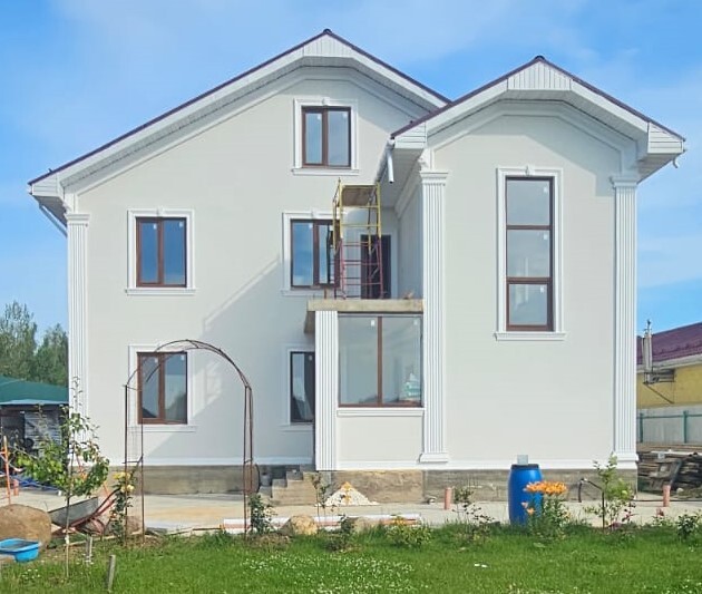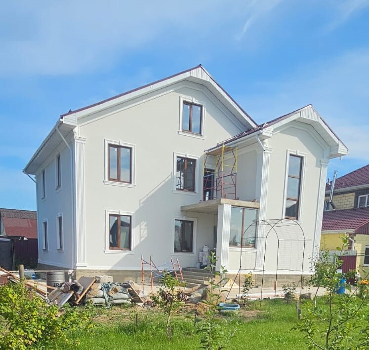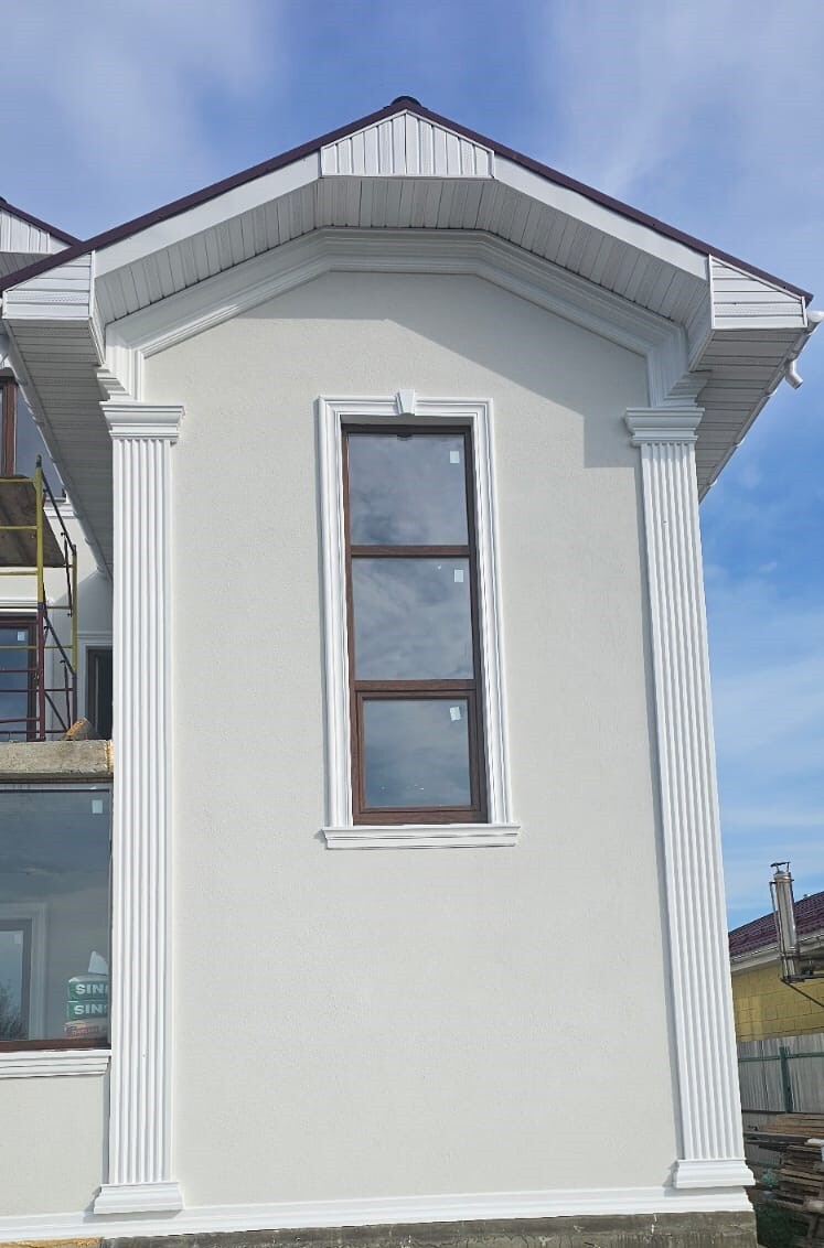 Фасад преобразился: визуально стал строже, выше и выразительнее. Появилась архитектурная логика и симметрия. Использование белого декора на фоне светлой штукатурки дало аккуратный, чистый, но при этом эффектный результат.
