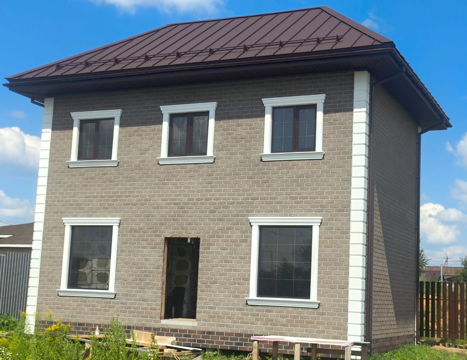 Результат: фасад дома приобрёл гармоничный и солидный вид. Светлый декор создаёт контраст с облицовкой под кирпич, подчёркивая архитектурную симметрию и аккуратность фасада.