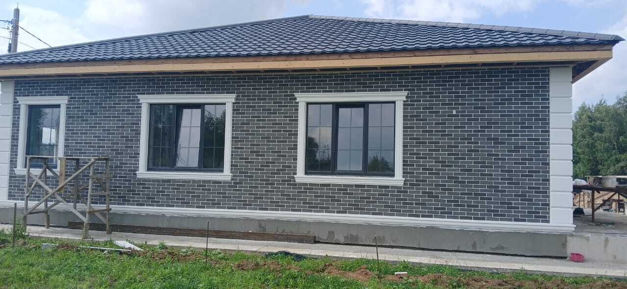 - Тёмная «кирпичная» плоскость и белые наличники дают чистый контур проёмов — окна визуально крупнее и «дороже».