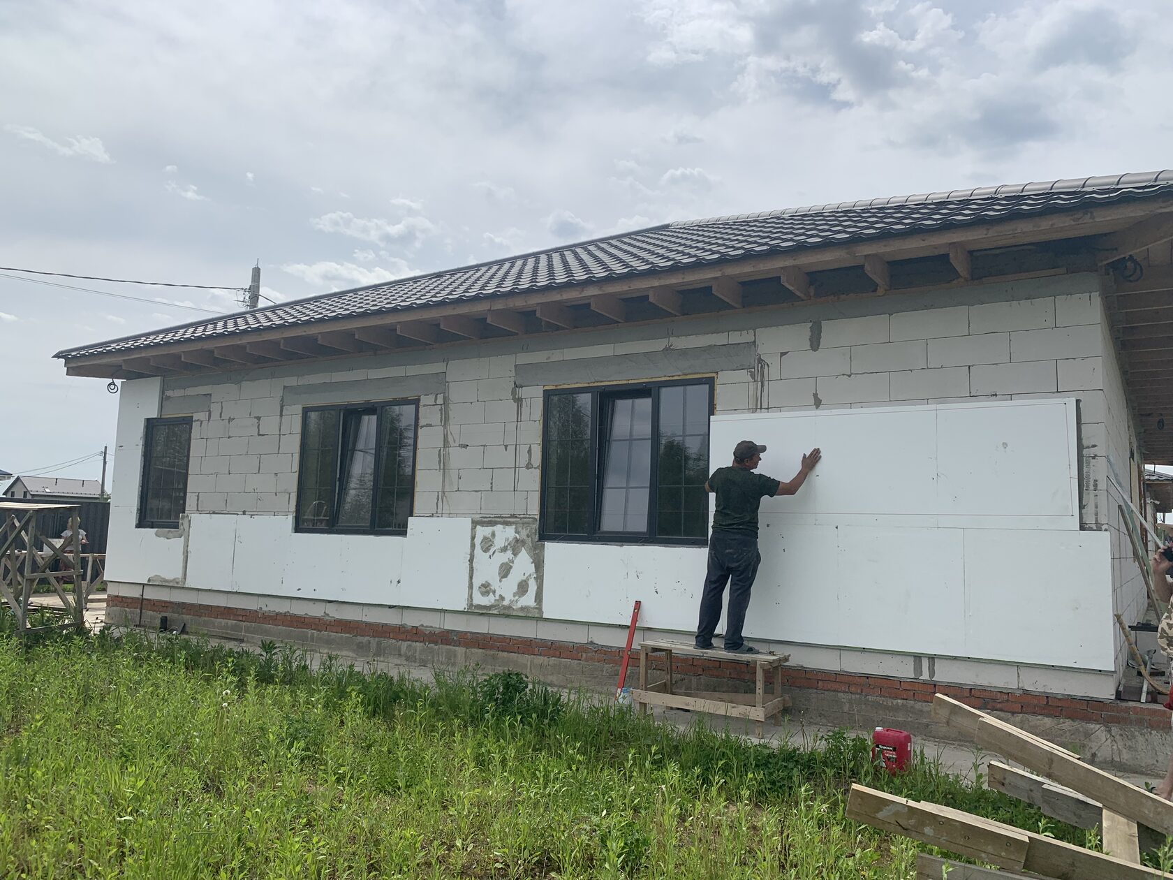 - До: коробка из блоков, идёт подготовка фасада под финишную отделку; на стене закрепляются листовые материалы (подготовительные работы), рядом ведутся сварочные работы металлоконструкций на площадке у дома.