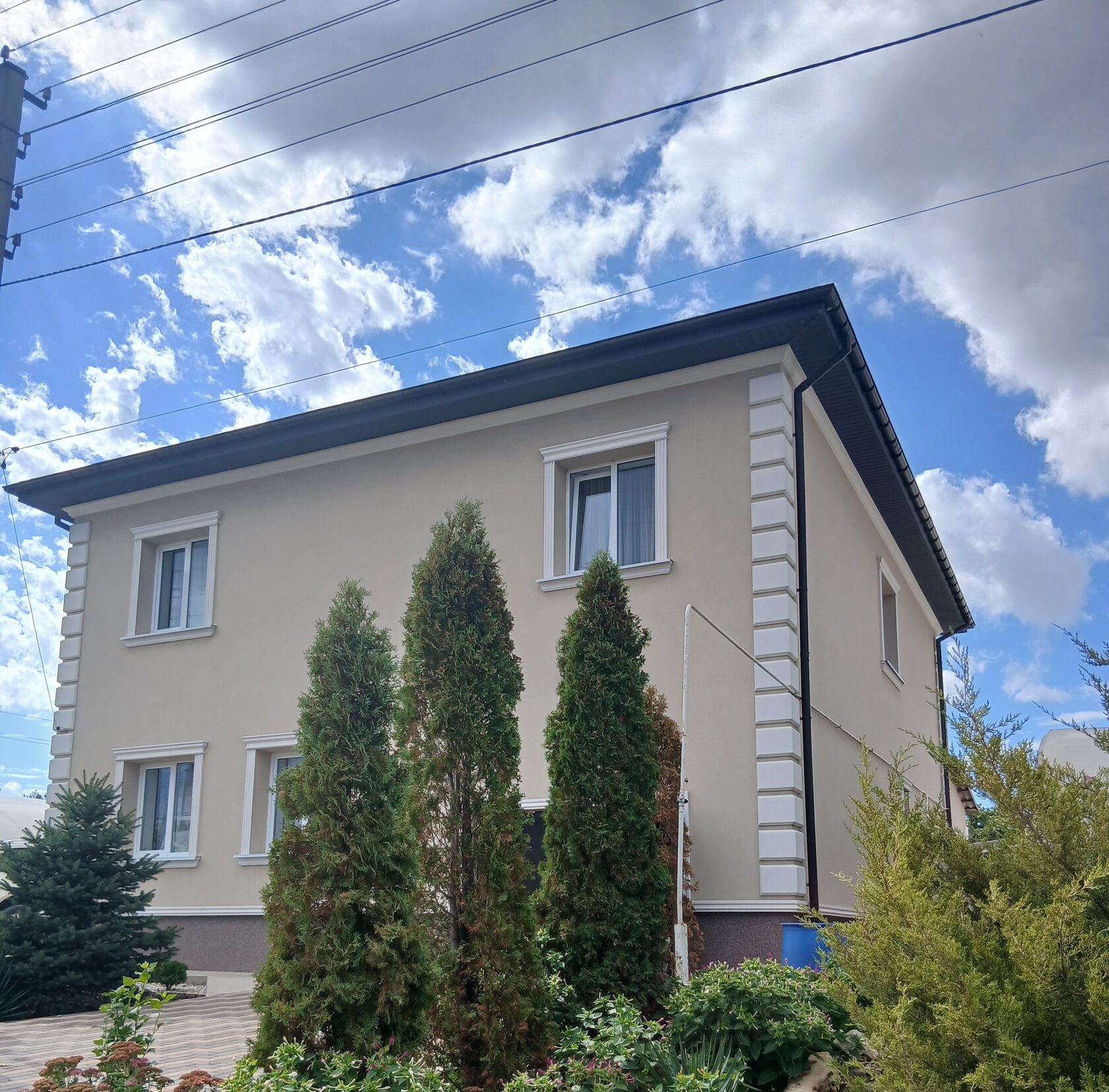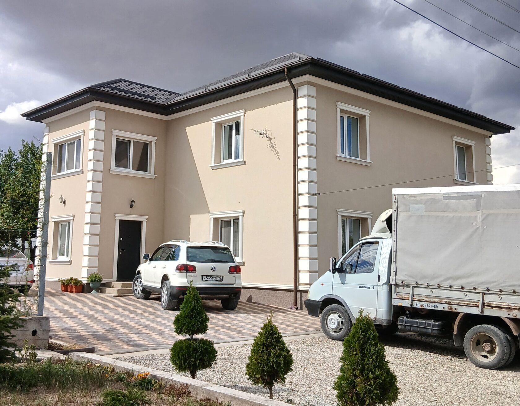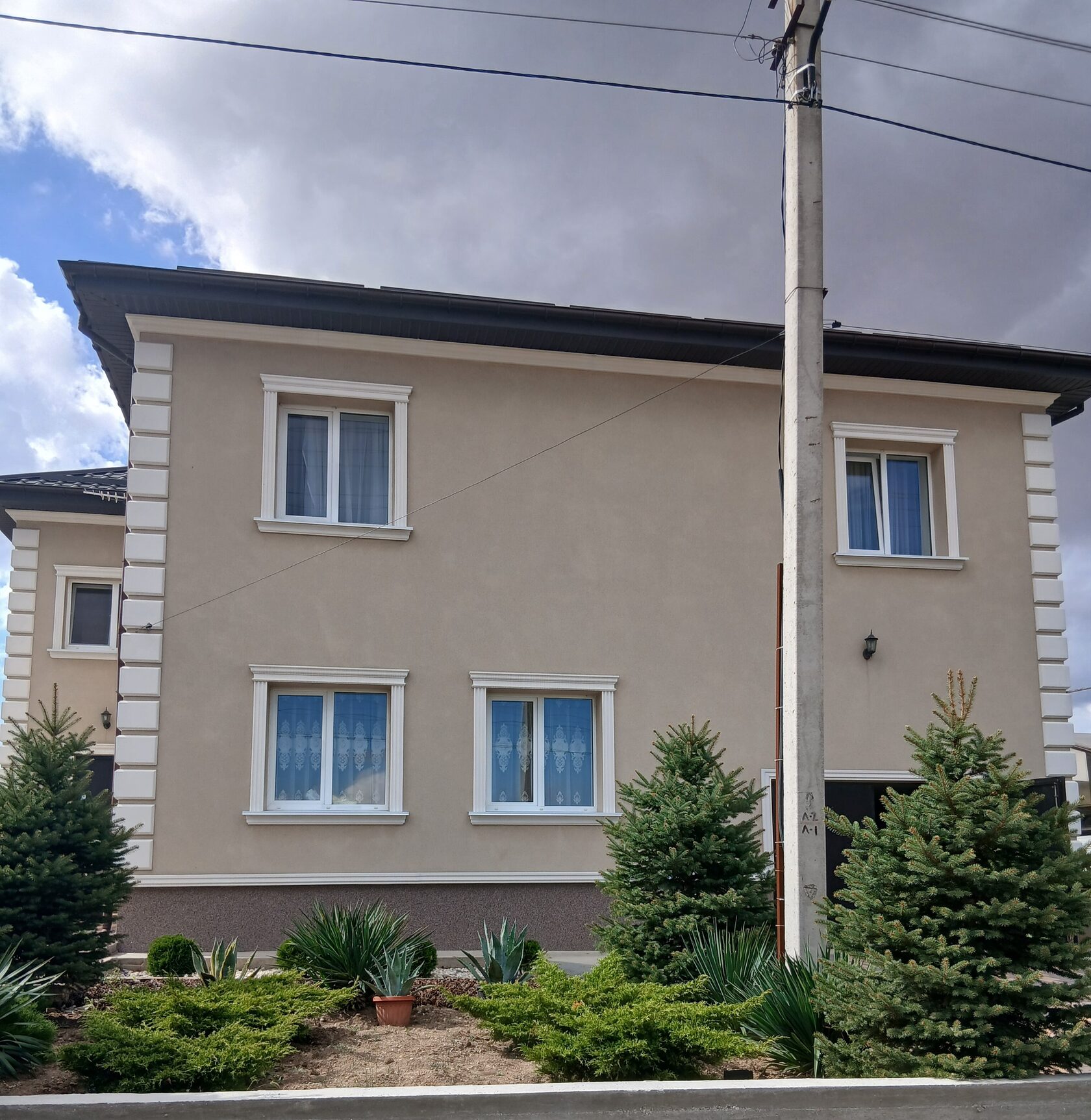 Мы оформили фасад частного дома в Гвардейском классическим декором из каталога «АрхитеК». Все изделия — готовые со склада, окна — комплект №5 (карниз С-6 + молдинг М-34 + подоконник П-5). Карниз под кровлей и цокольный пояс «собрали» плоскости, русты усилили углы — аккуратный результат без перегруза.