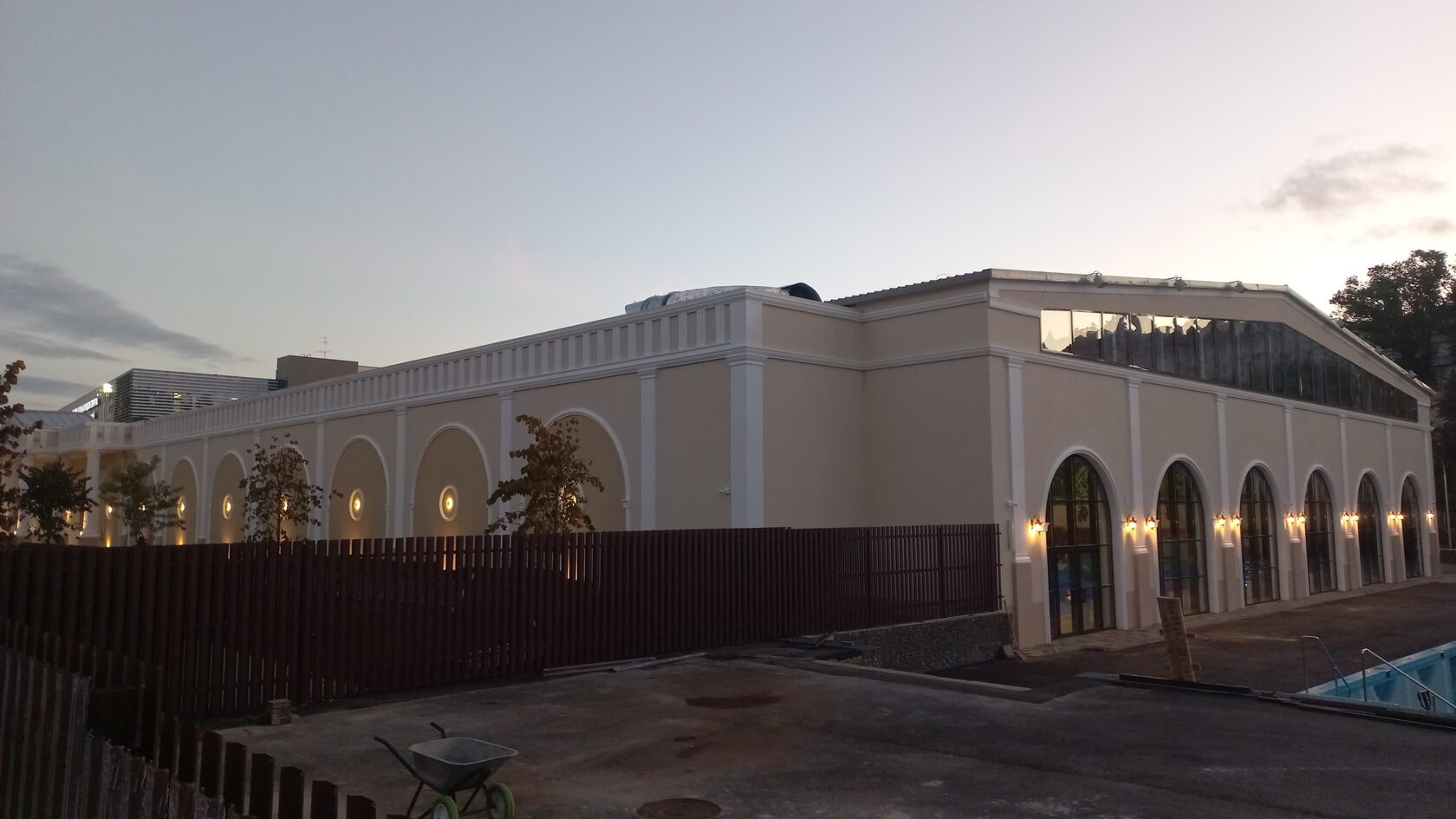 - Задачи: сохранить ритм арок и колонн по всей длине фасада, интегрировать подсветку и витражи бассейнов, уложиться в сжатые сроки запуска.