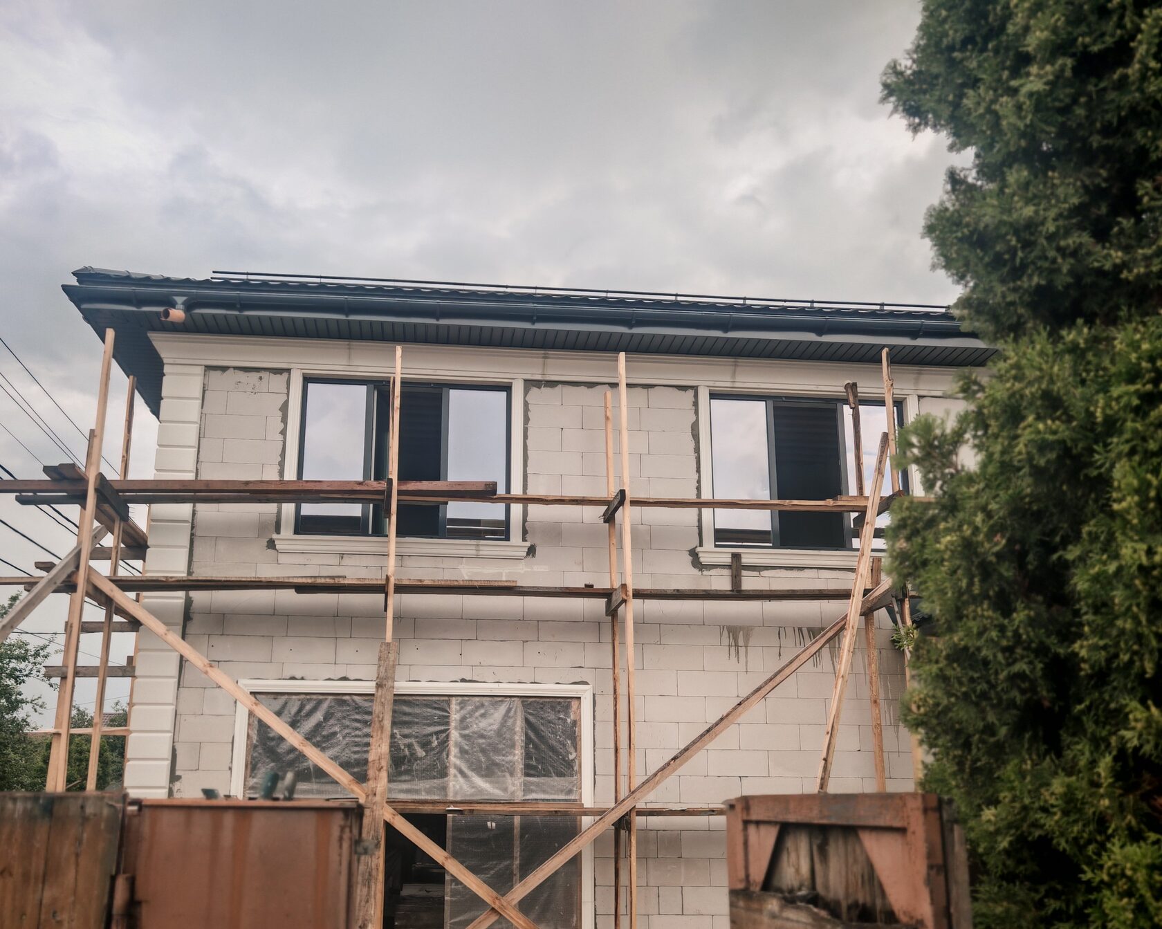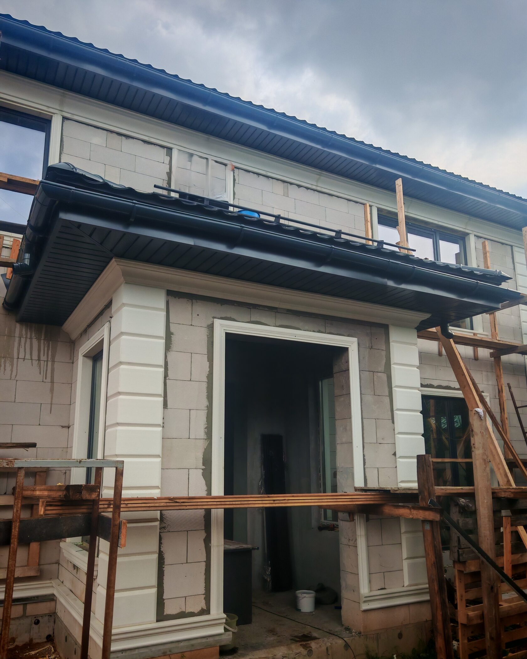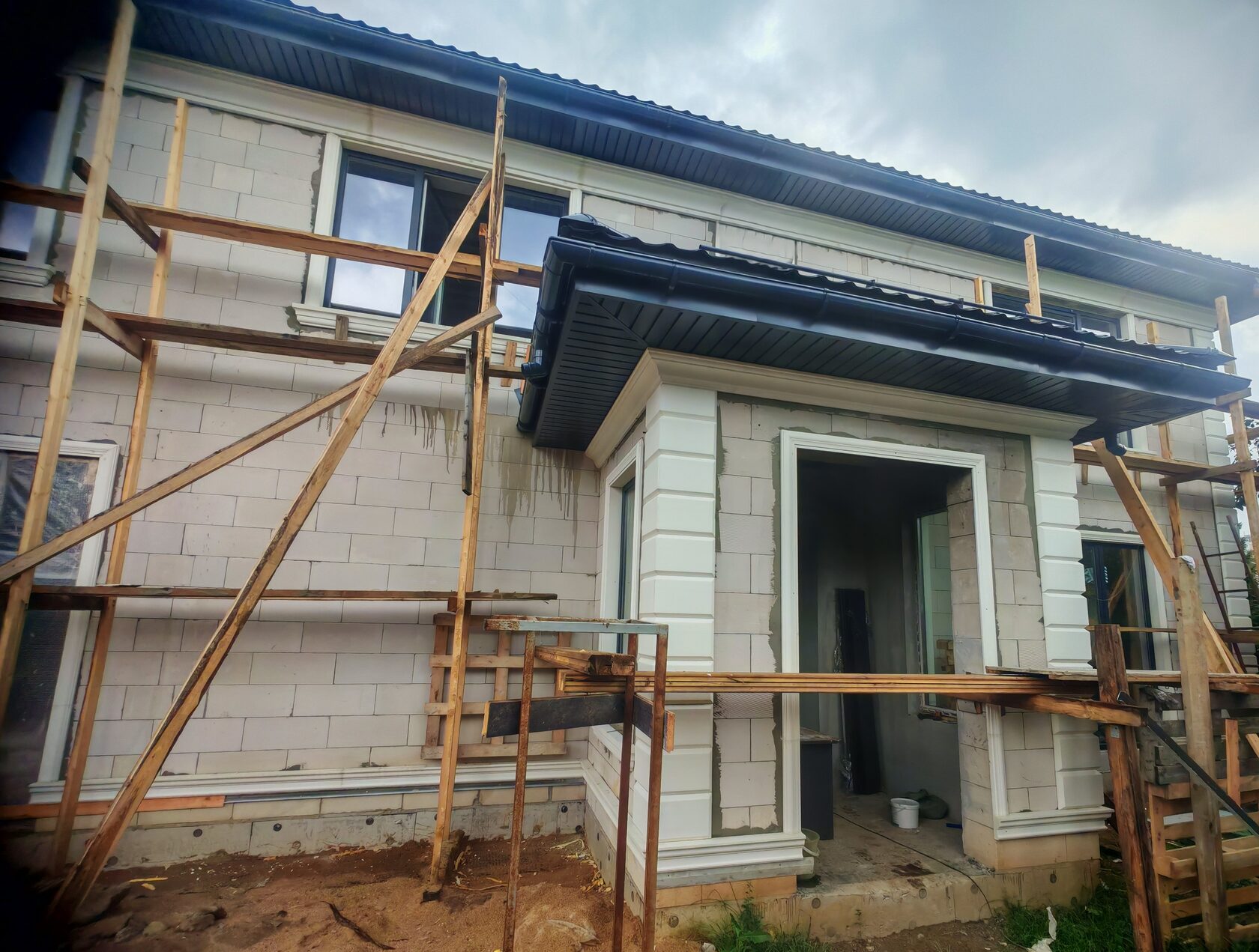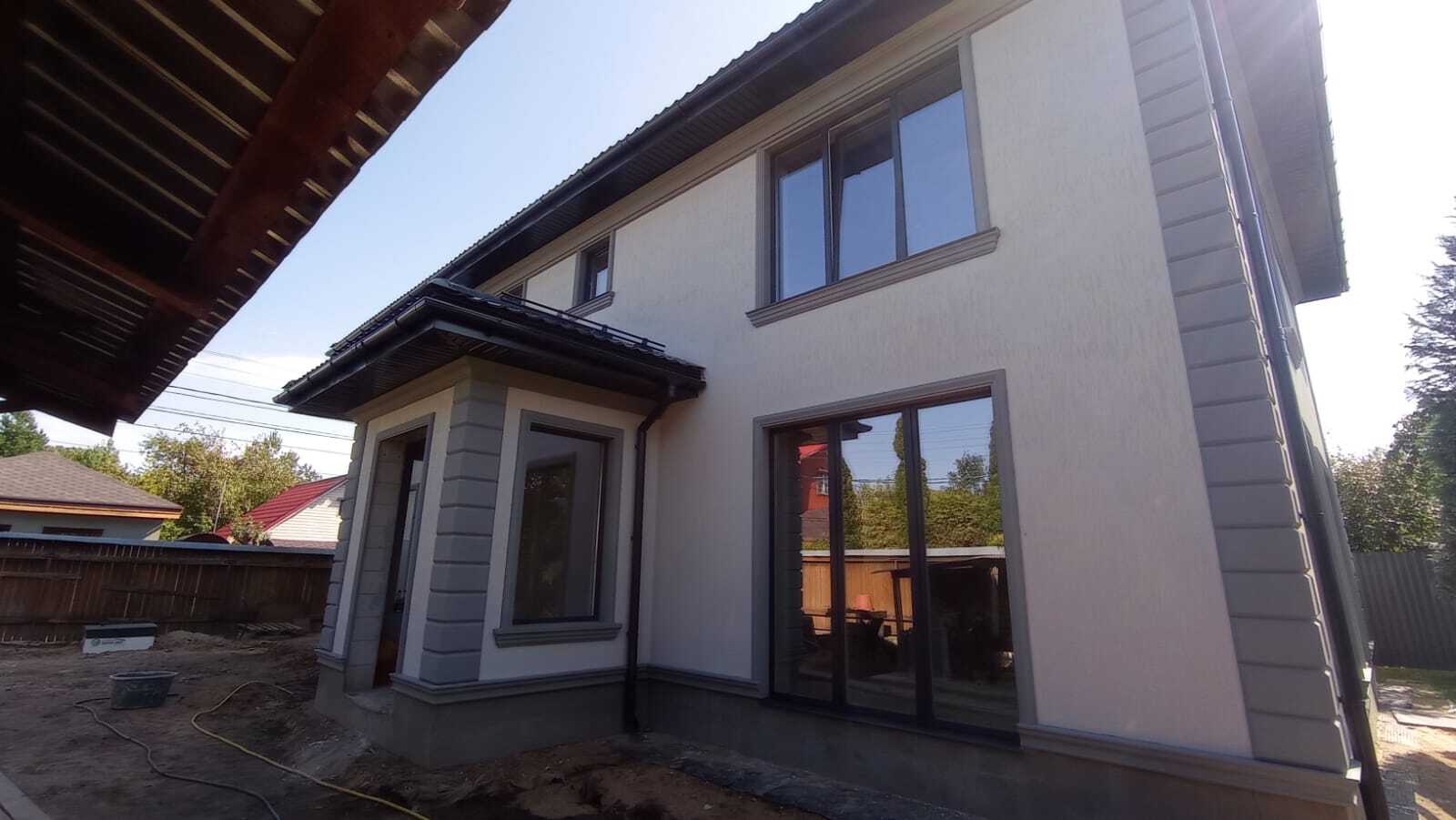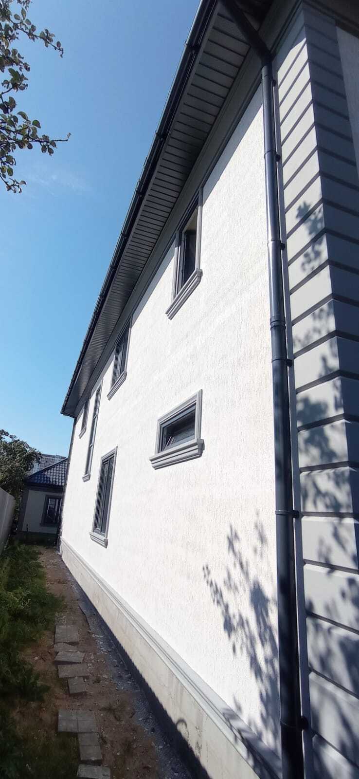 - После отделки: светлые стены, серый декор; водосточная система и софиты тёмные, совпадают по тону с декором.