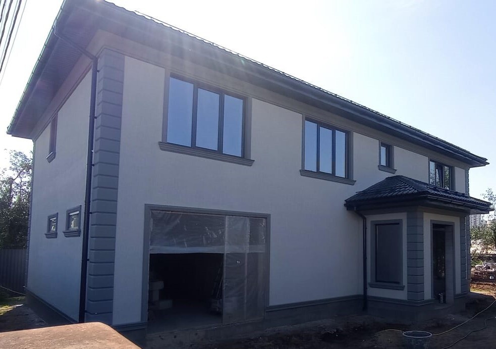 - двухцветной схеме: светлое поле фасада + контрастный серый декор (углы, пояса, наличники, подоконные профили).