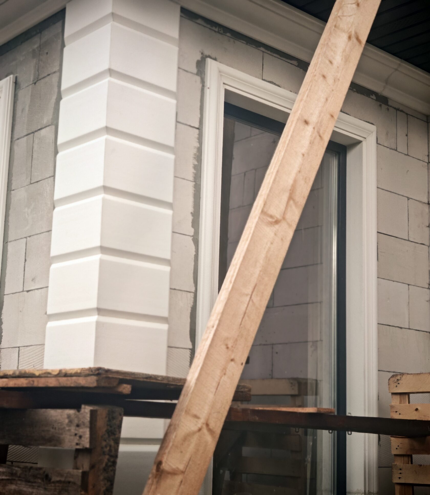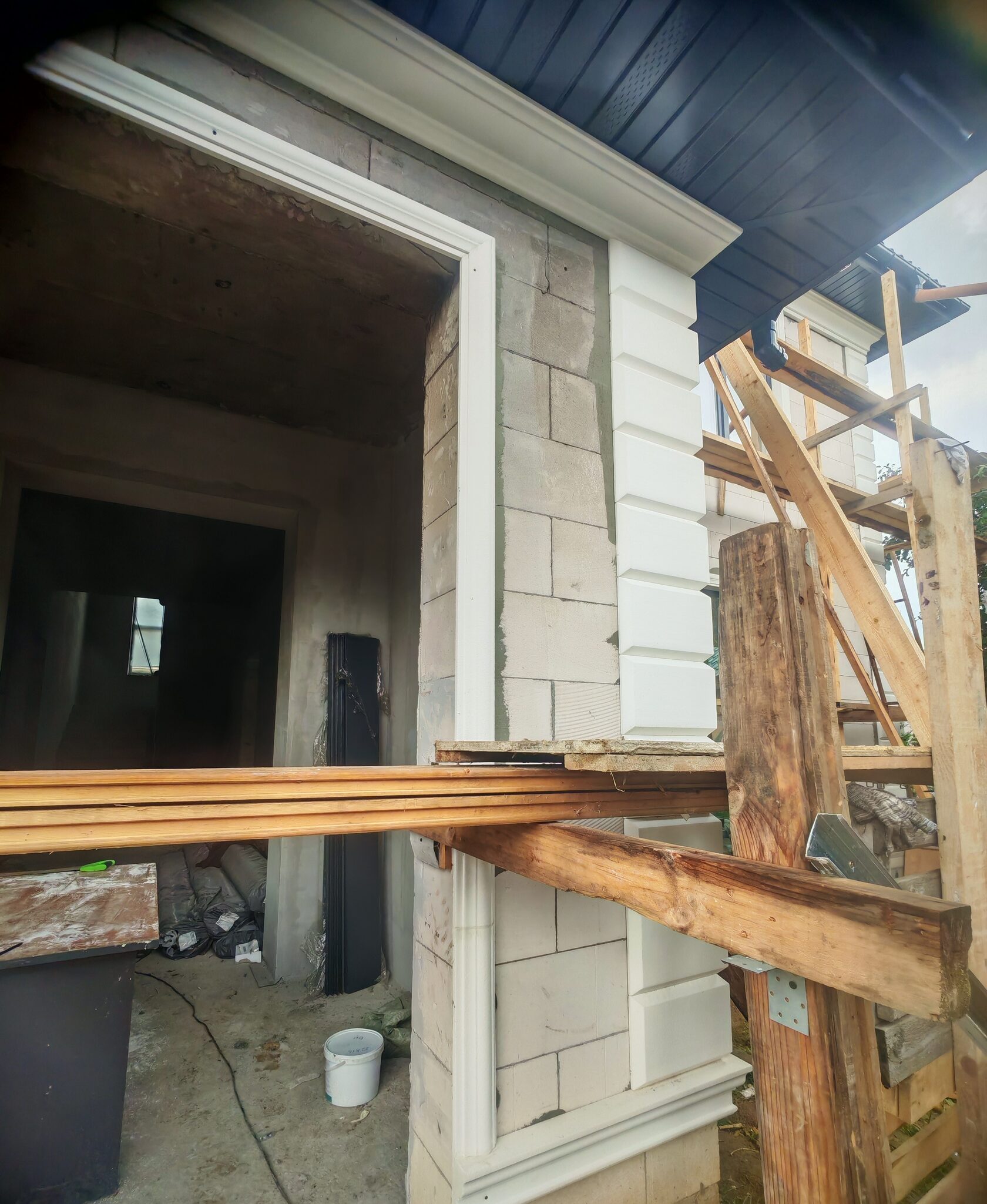 - Угловые рустованные пилястры на всех внешних углах и на входной группе (регулярные «ступенчатые» блоки).