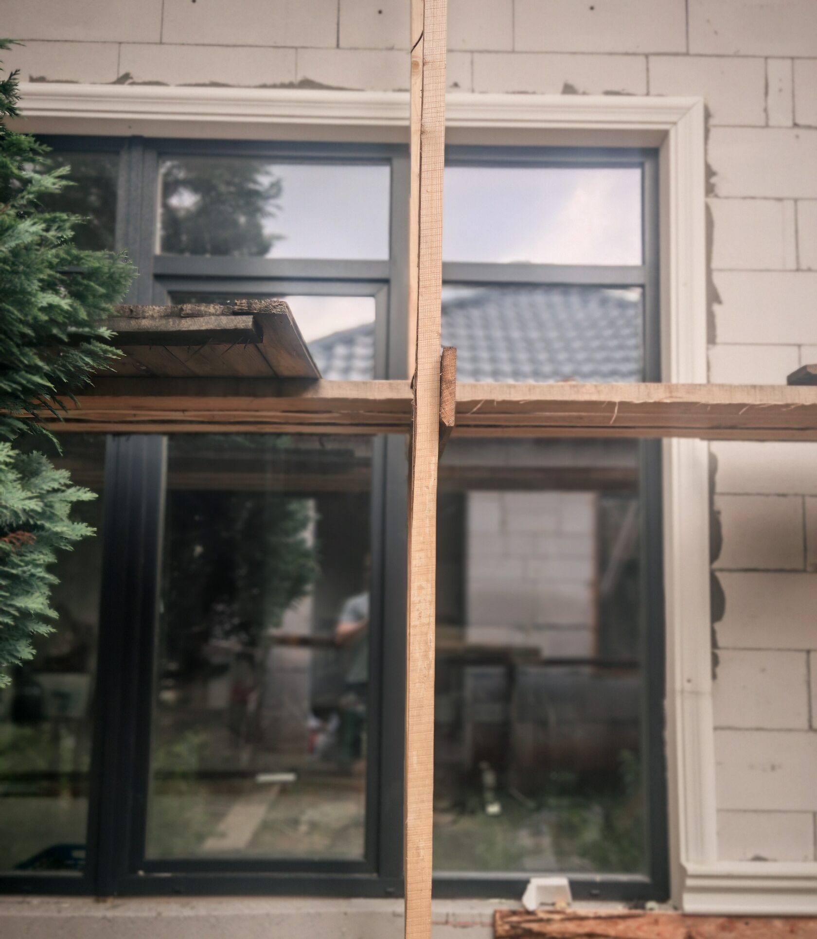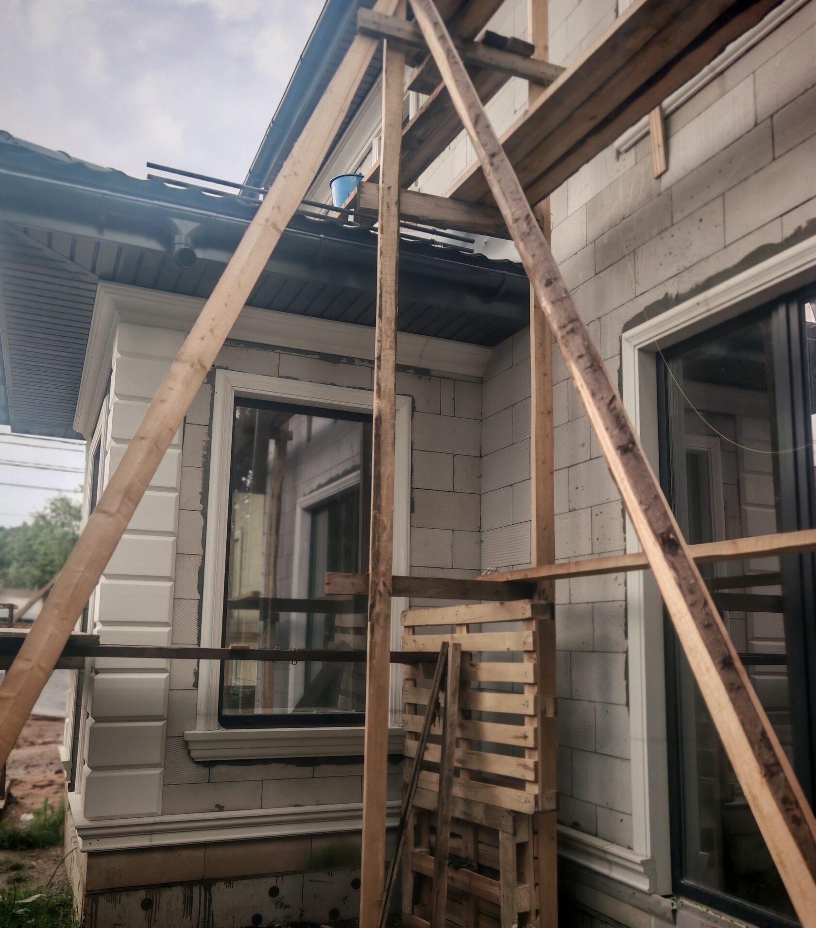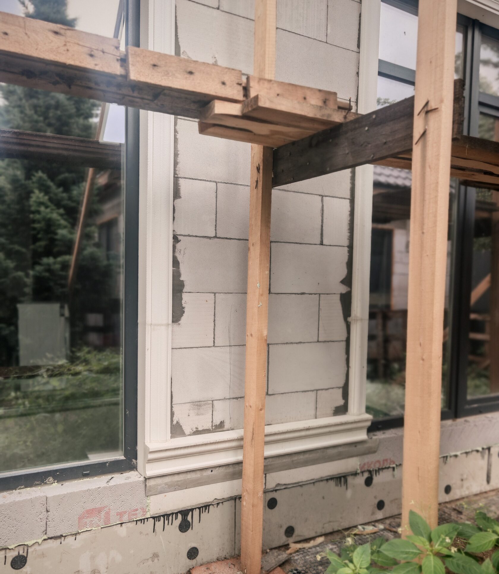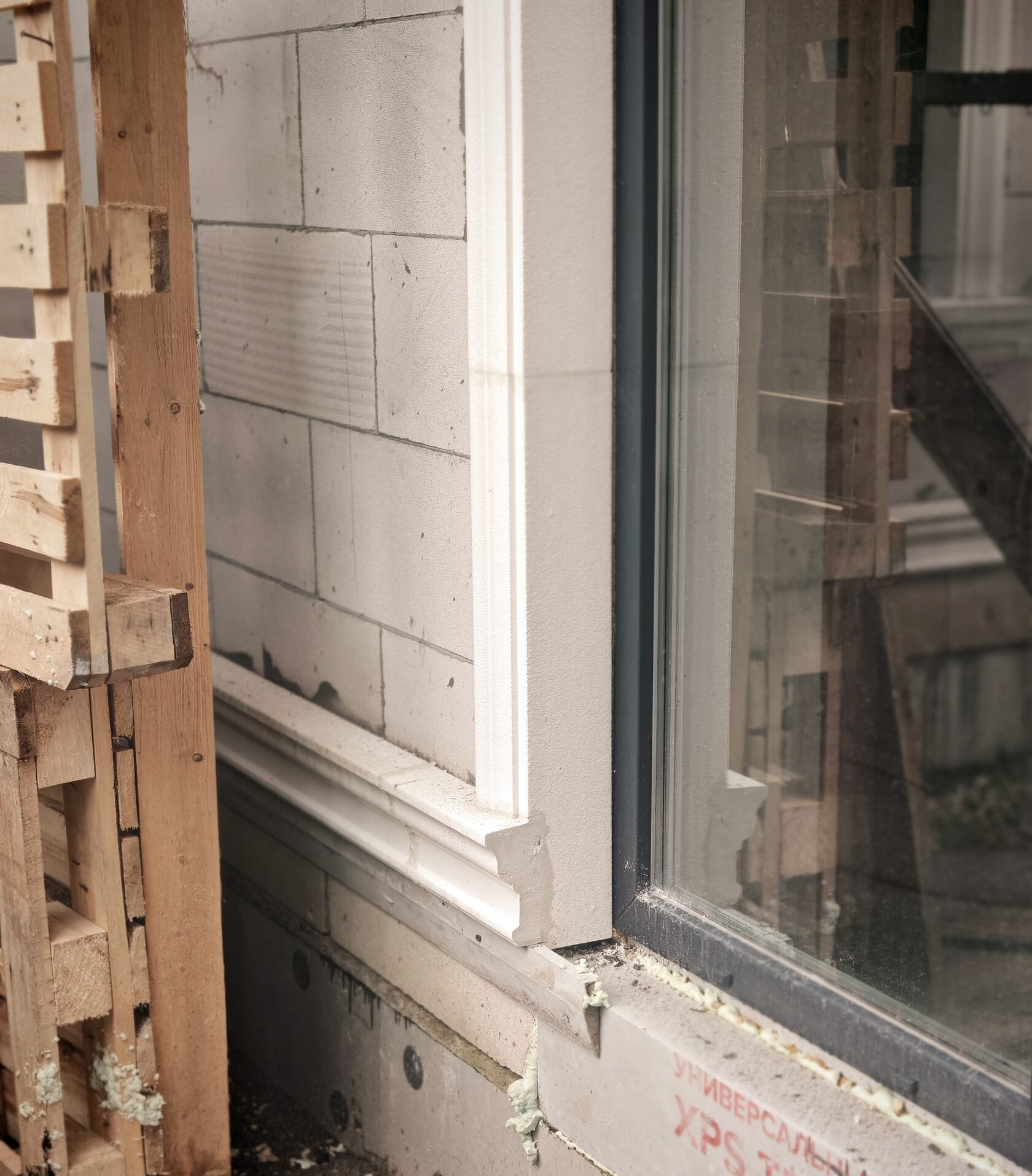 - Подоконные профили под стандартными окнами; панорамные проёмы 1-го этажа — без выступающей полки (только обрамление).