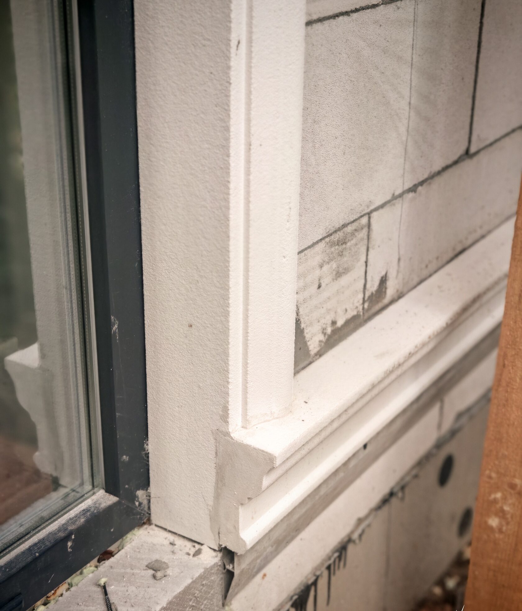 - Пенополистирол с мраморно-акриловым покрытием «АрхитеК» — стойкая к осадкам и УФ фактура; на макро-кадрах видна равномерная текстура покрытия и аккуратные примыкания к откосам.