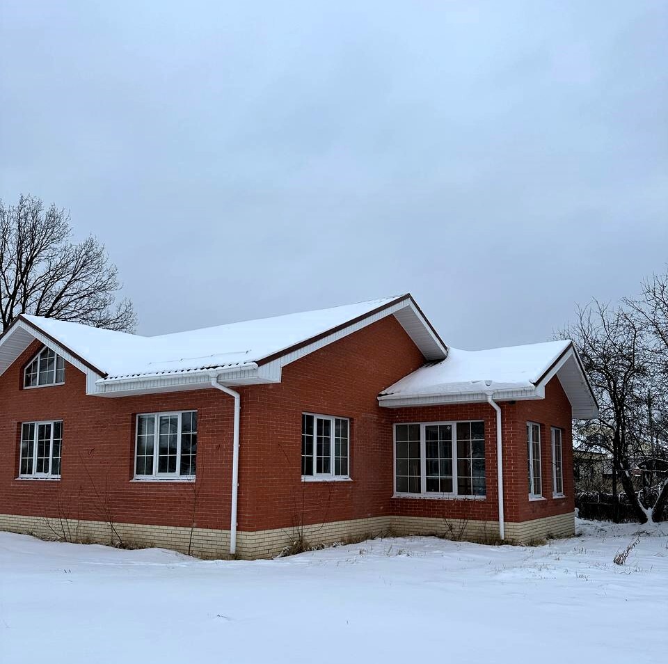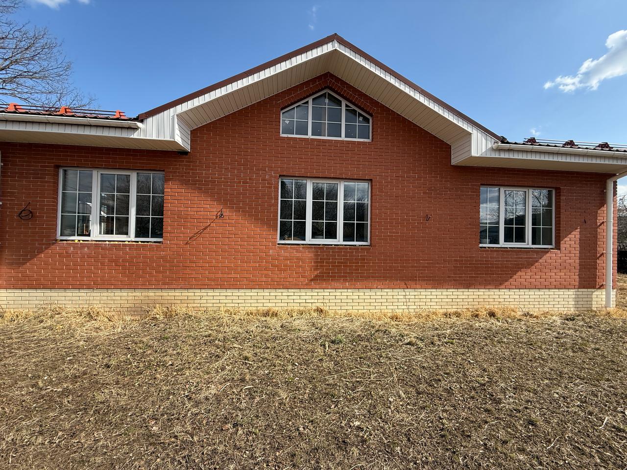 - Дом из облицовочного кирпича с белыми оконными рамами.