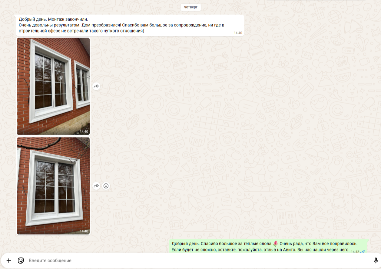 После завершения монтажа клиент прислал фото «после» и подробное сообщение в мессенджер о том, что дом заметно преобразился и результатом остались очень довольны.