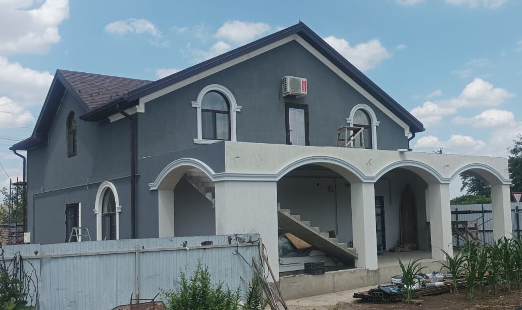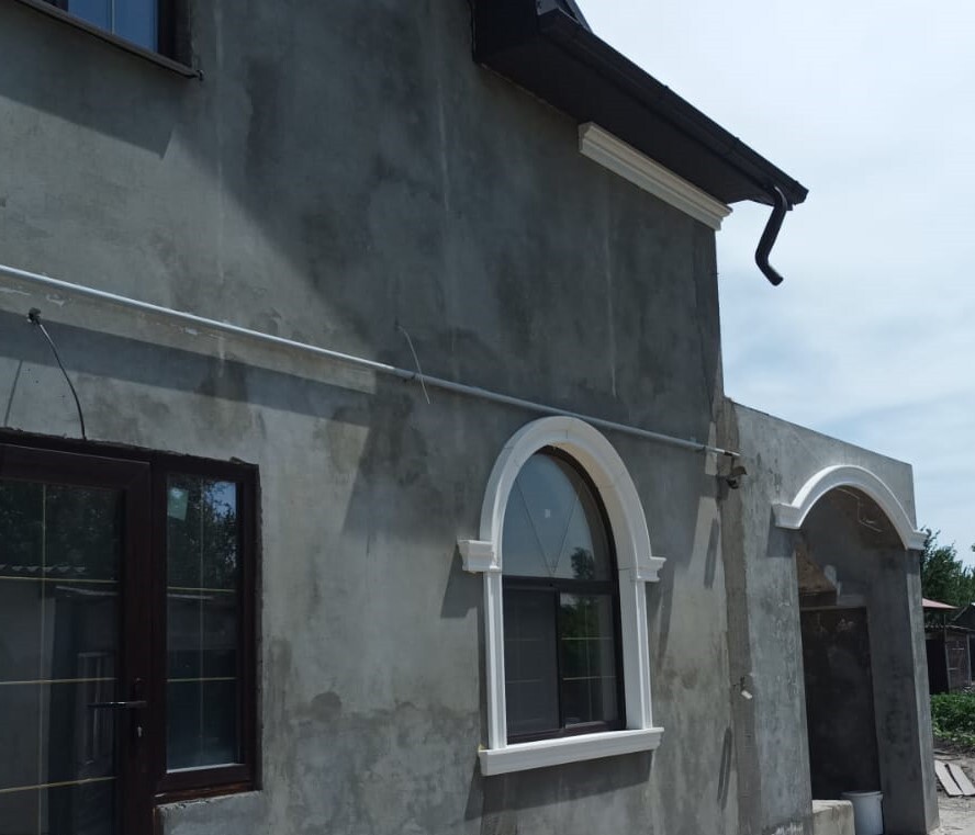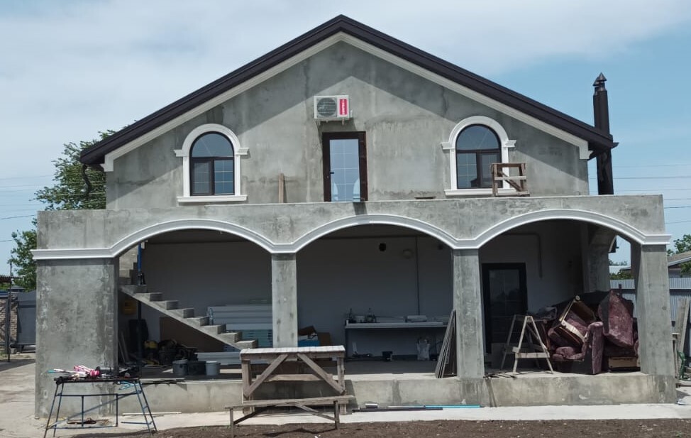 Фасад дома приобрёл выразительный и гармоничный облик. Арочные окна и порталы стали главным акцентом, а светлый декор на контрасте с тёмной штукатуркой подчеркнул архитектурные линии и придал дому индивидуальность.