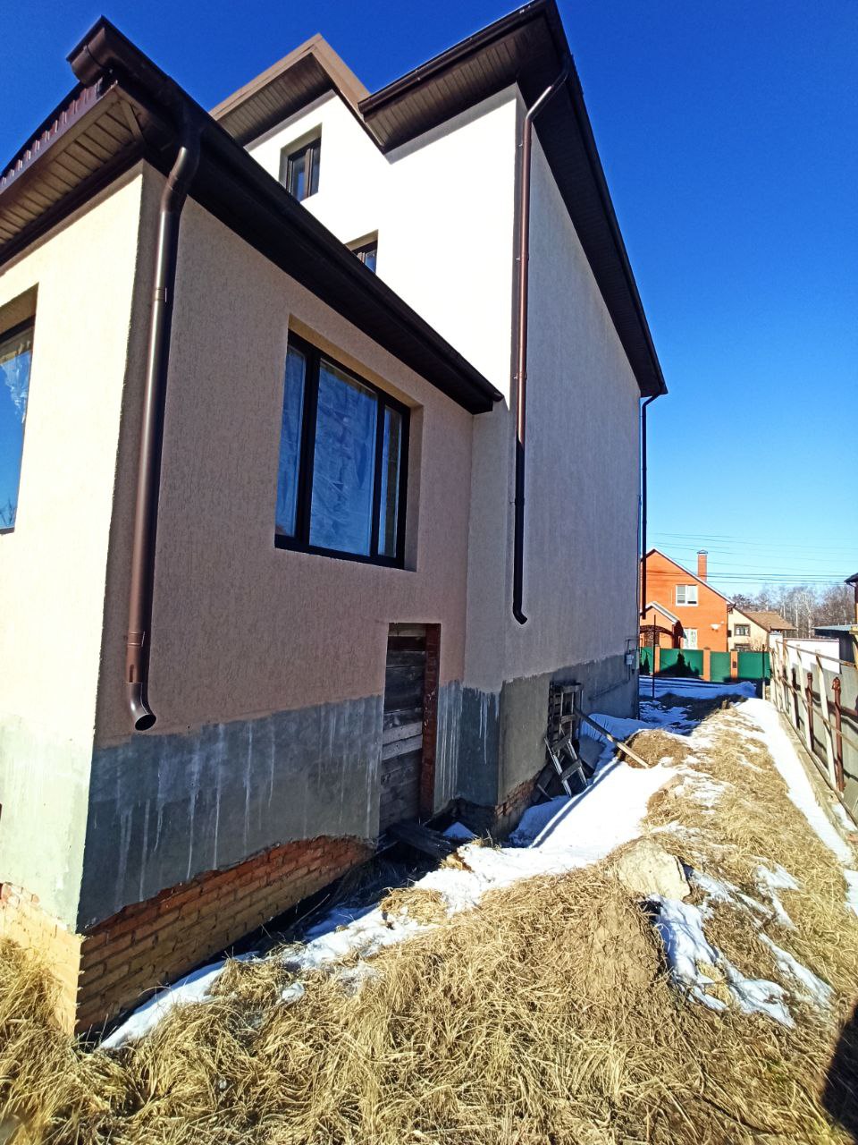 - Цокольный пояс — выраженная горизонталь на границе со цоколем.