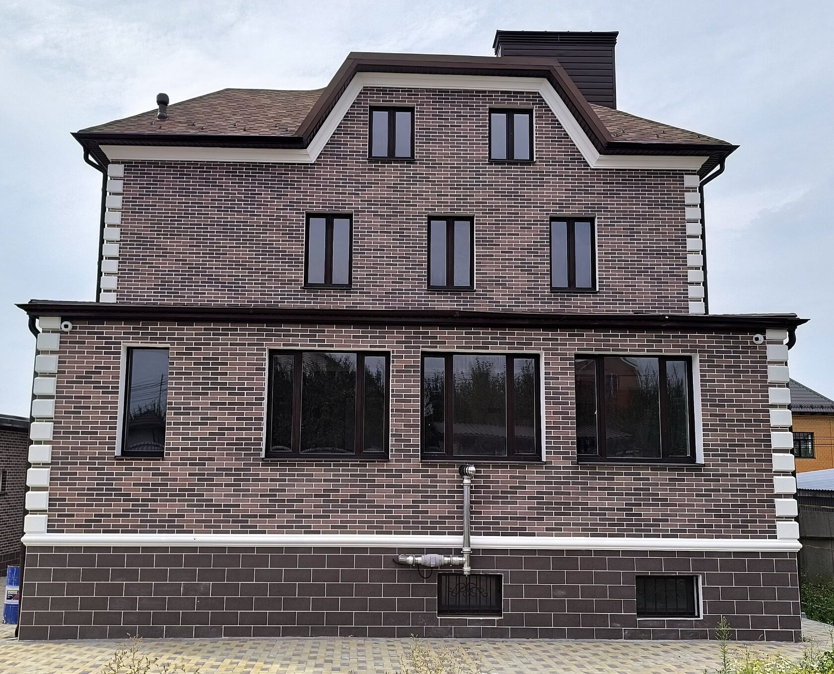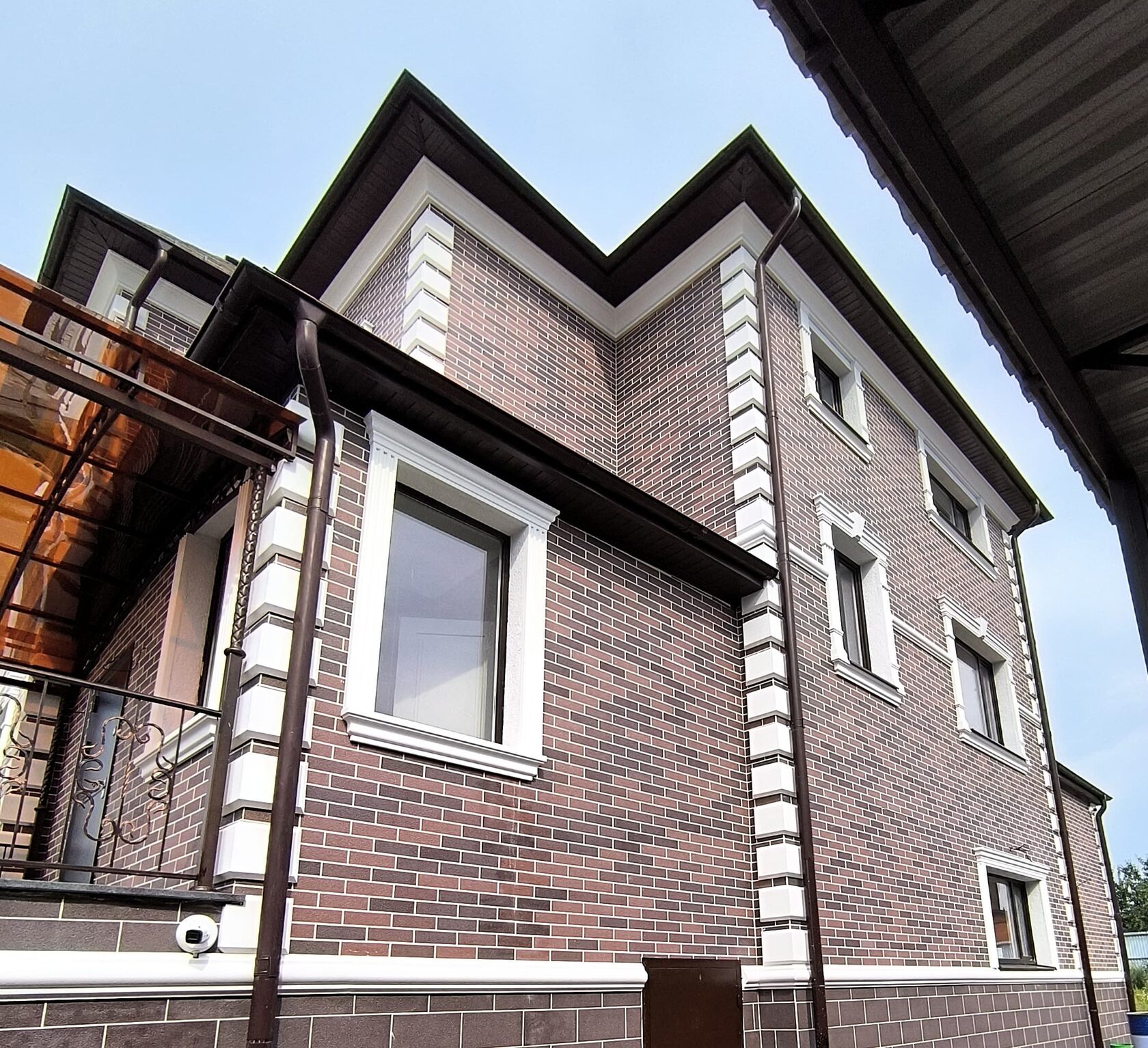 - Карниз под кровлей — широкий, завершающий, формирует тень и «крышу» фасада.