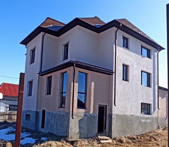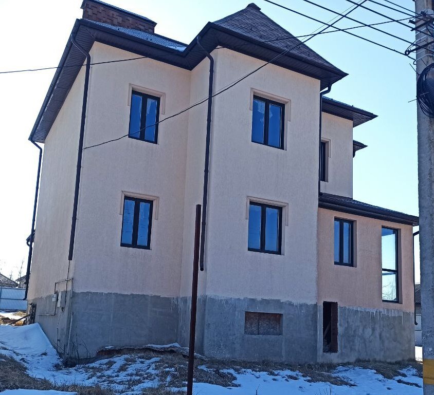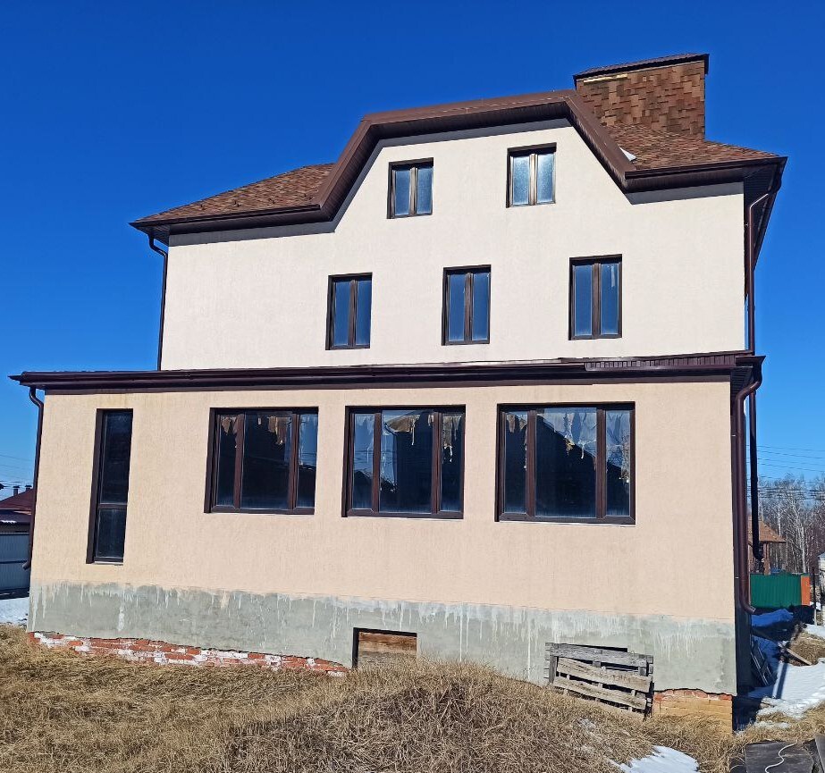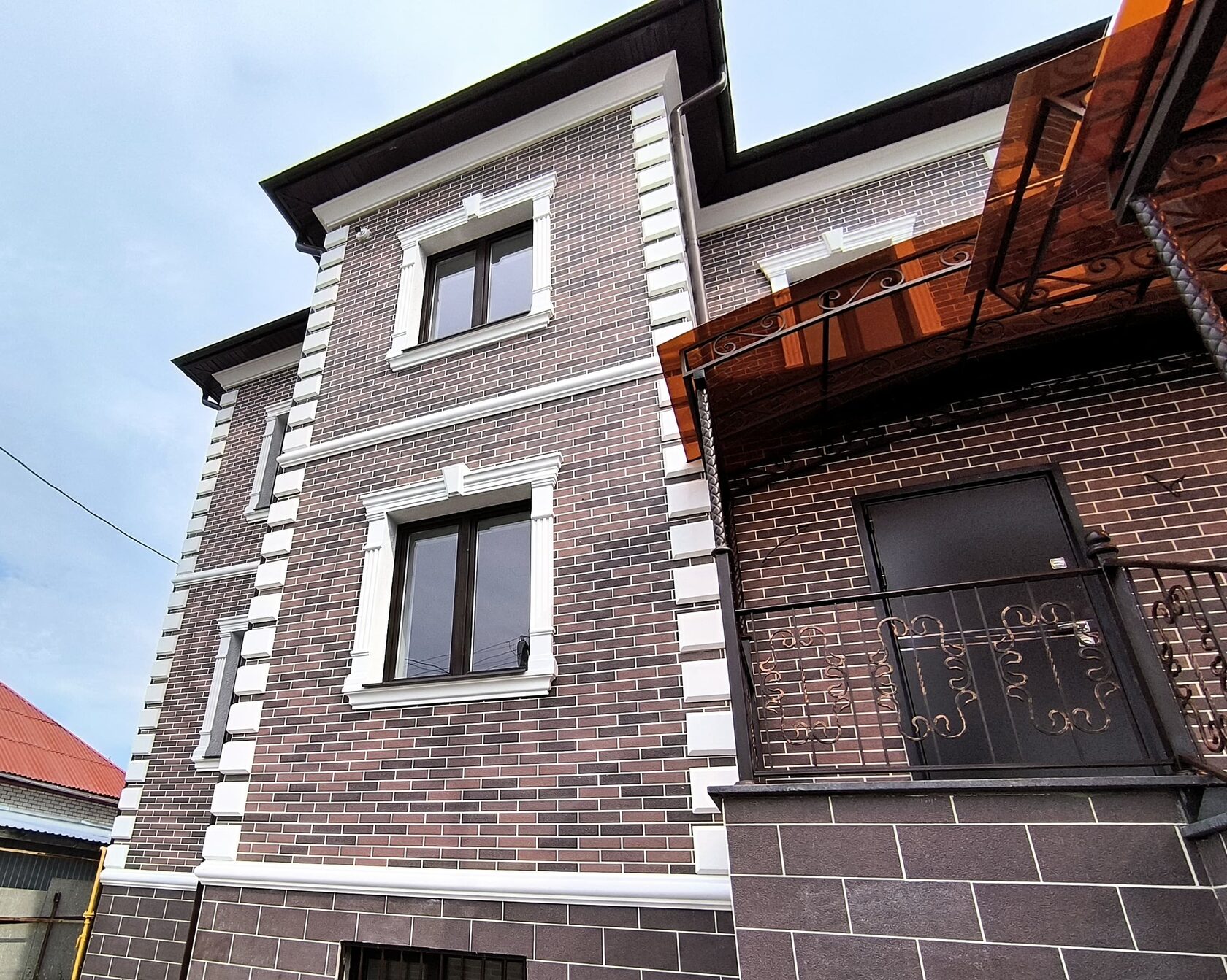 - Оконные наличники прямой геометрии, с верхним замковым элементом на части окон и аккуратным подоконным профилем.