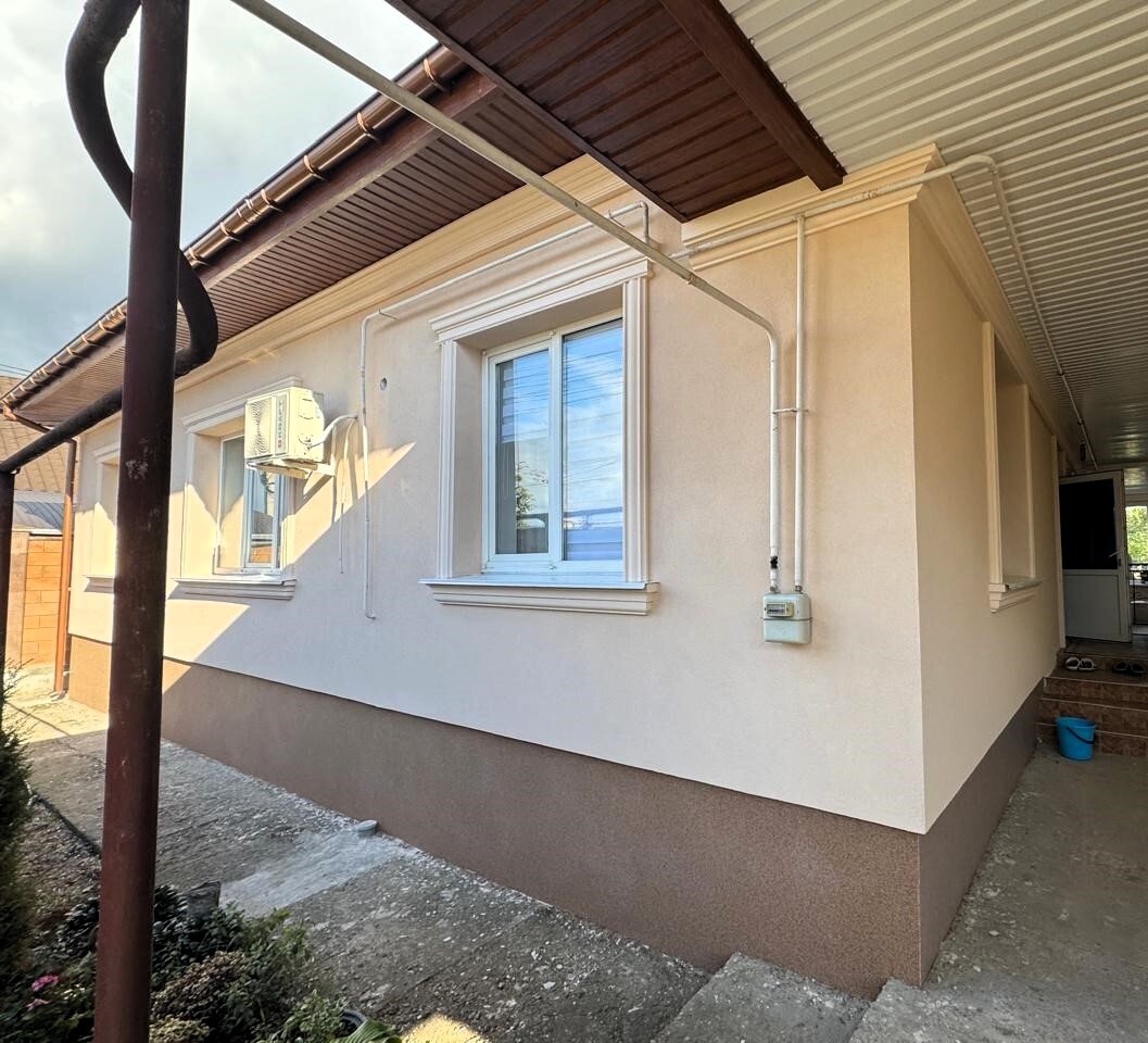 - После: теплый фасад, четкие обрамления окон, собранный карниз, аккуратный цоколь.