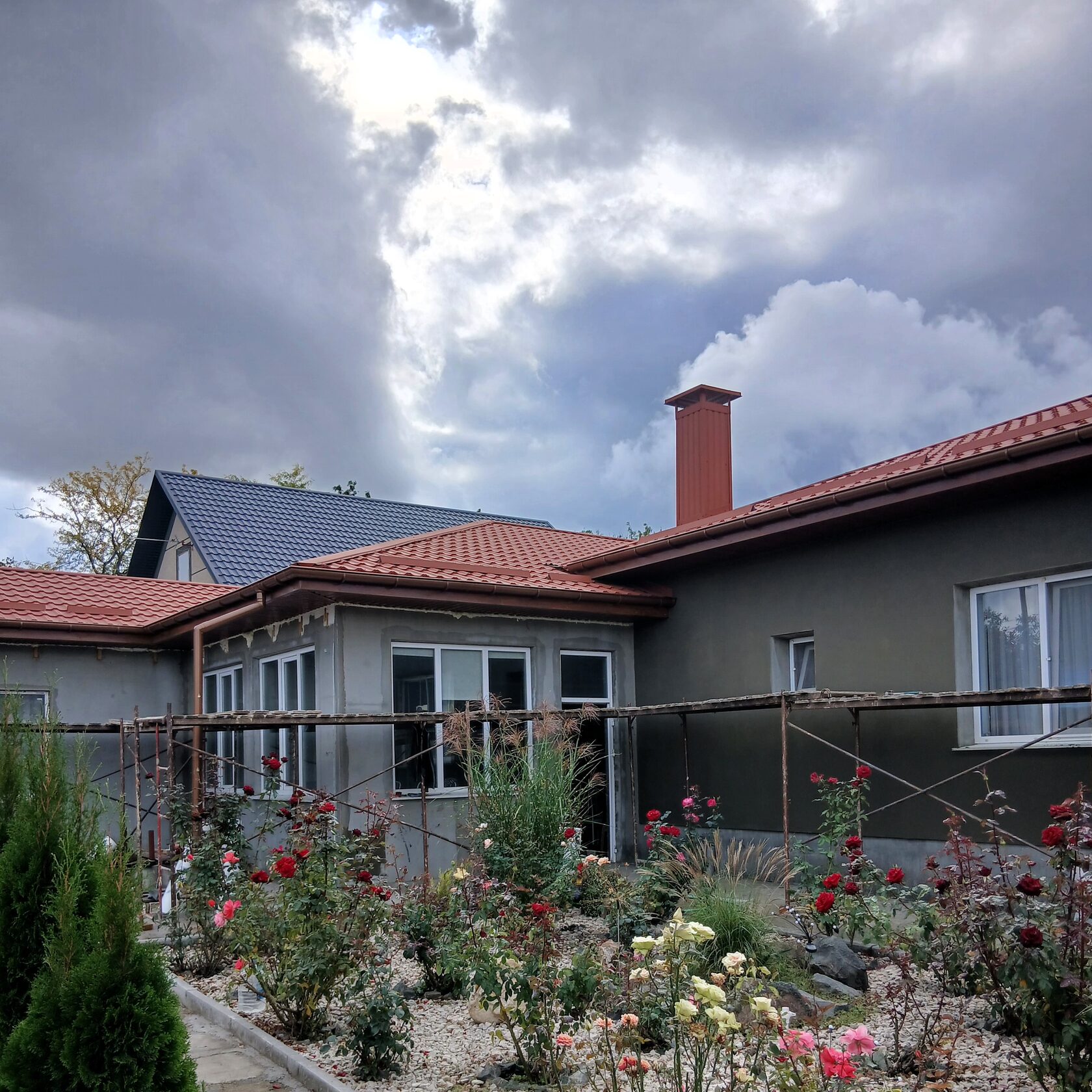 - Единая палитра фасад/цоколь увязала кровлю и водосток.