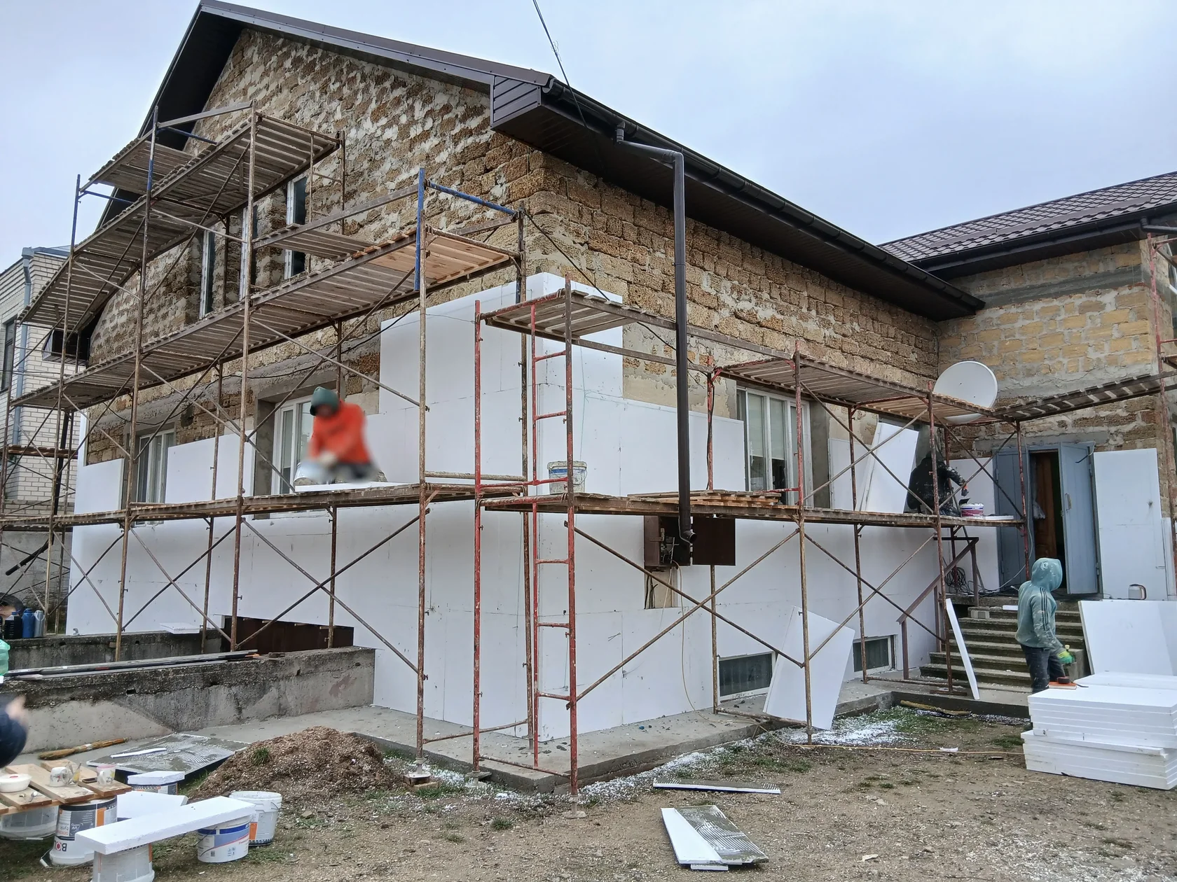 На старте фасад выглядел технически: плоскость стен без архитектурной структуры, окна без обрамления, углы визуально “провалены”. Параллельно шли строительные работы по основанию (подготовка, утепление/подкладочные плиты, леса) — то есть фасад ещё не имел финального лица.
