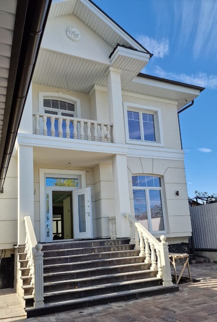 На фото — фасад после монтажа: классическая композиция с симметричным порталом, балконом и балюстрадой; пояса «собирают» объём, а карниз под кровлю завершает силуэт дома. Все профили повторены по проектным размерам; декоративный барельеф изготовлен индивидуально.