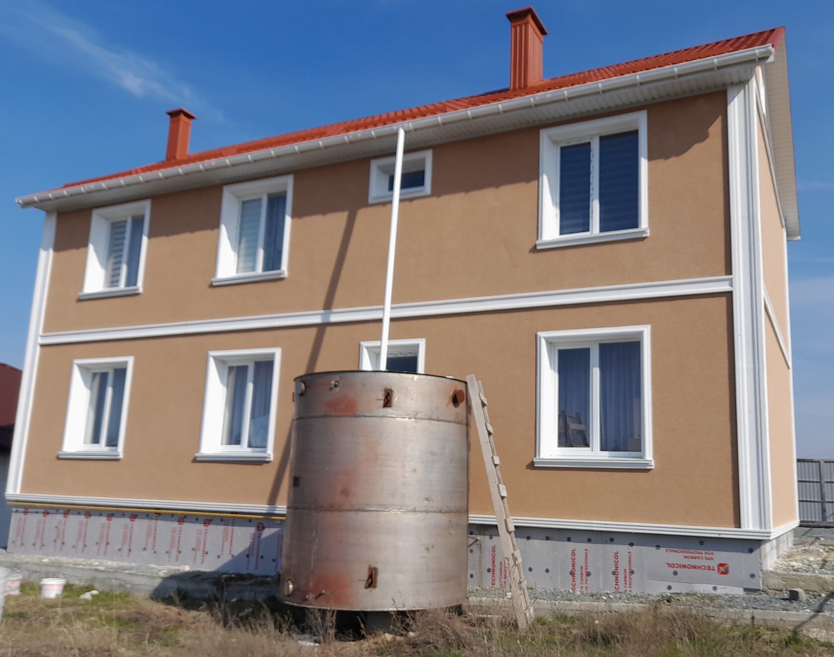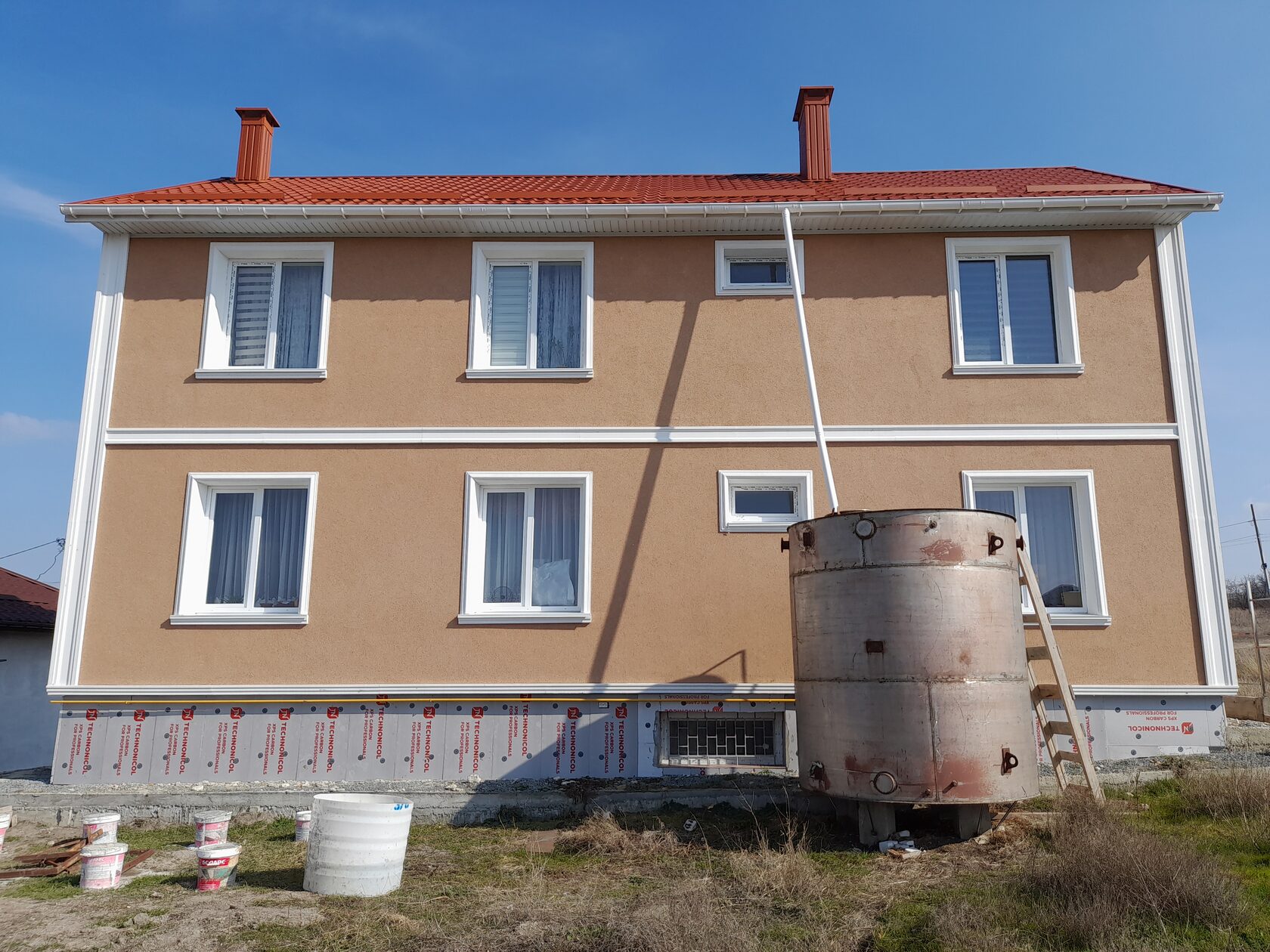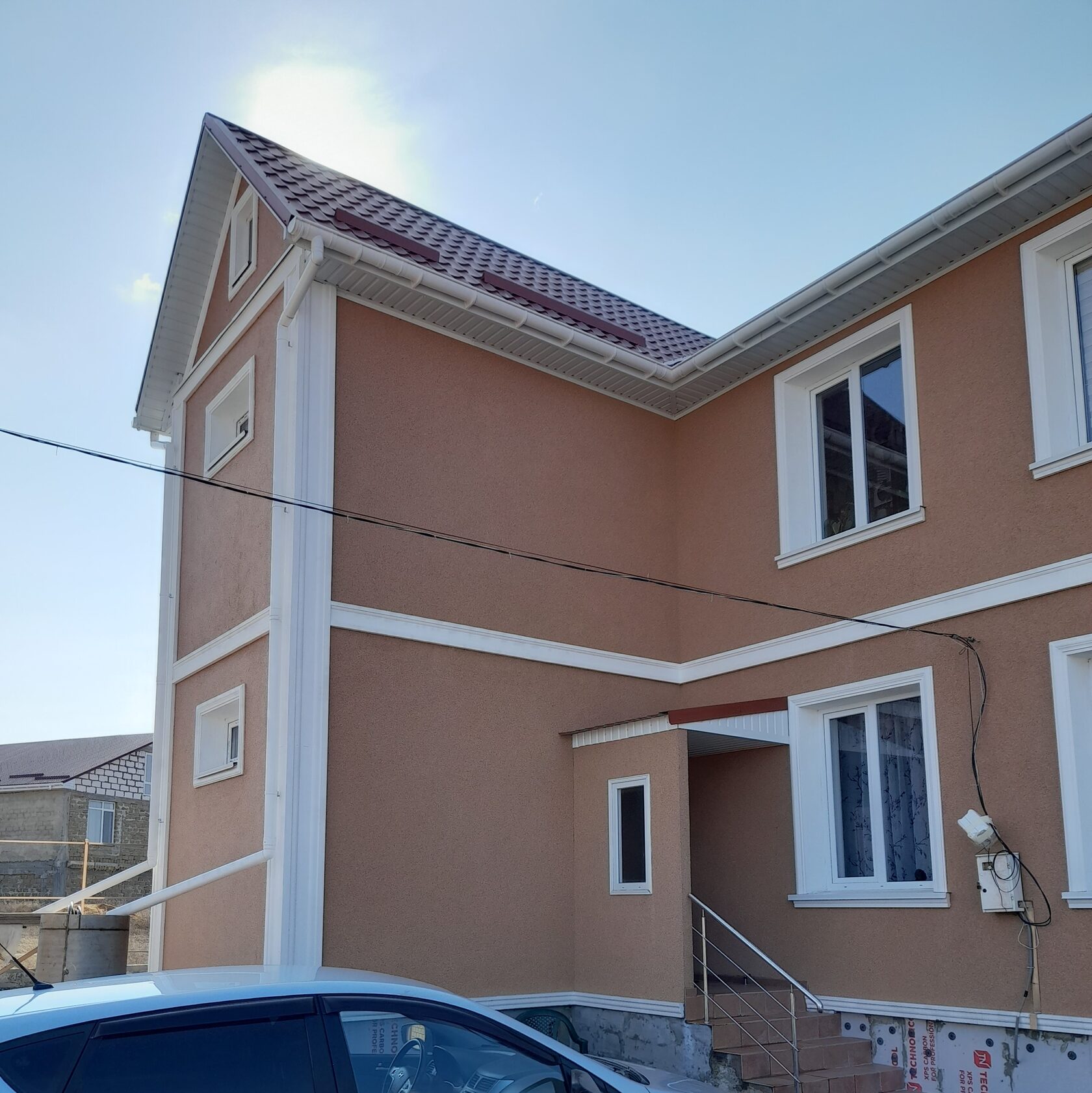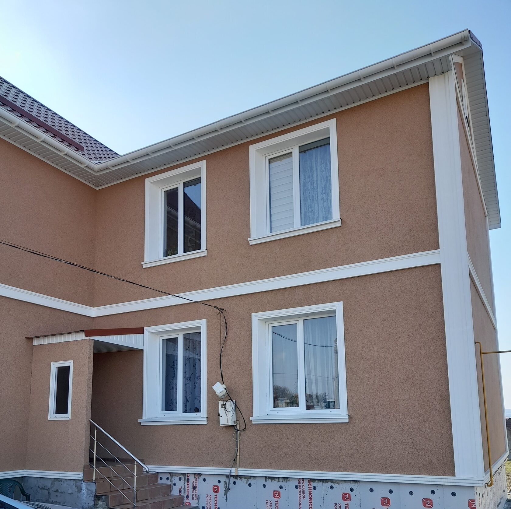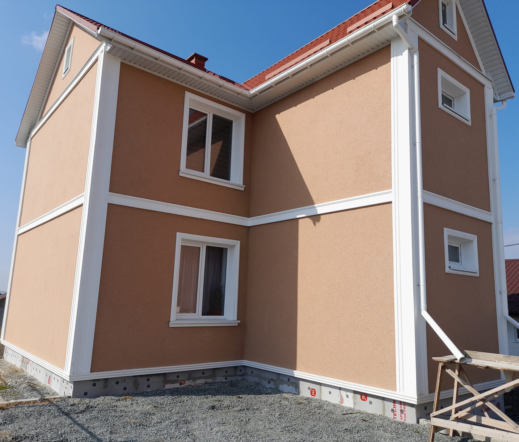 По данным фотографиям и техническому описанию выполнено оформление двухэтажного дома фасадным декором из пенополистирола с защитным покрытием. Применены оконные наличники с подоконными элементами, угловые пилястры, межэтажный пояс и цокольный пояс. Декор окрашен в белый цвет и поддерживает цвет окон и водосточной системы. Кровля — красная металлочерепица, фасад — декоративная штукатурка тёплого бежево-терракотового оттенка. Итоговый образ — сдержанная современная классика.